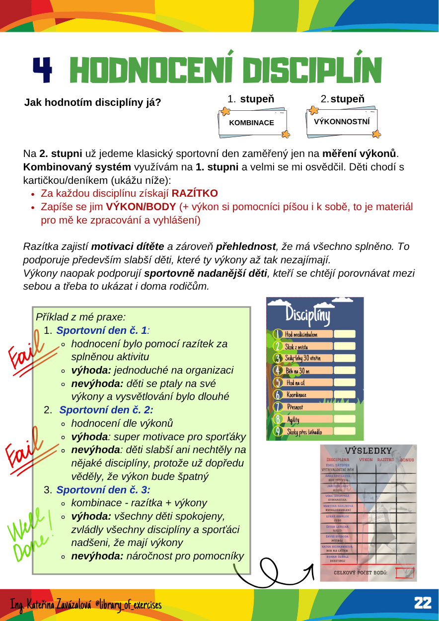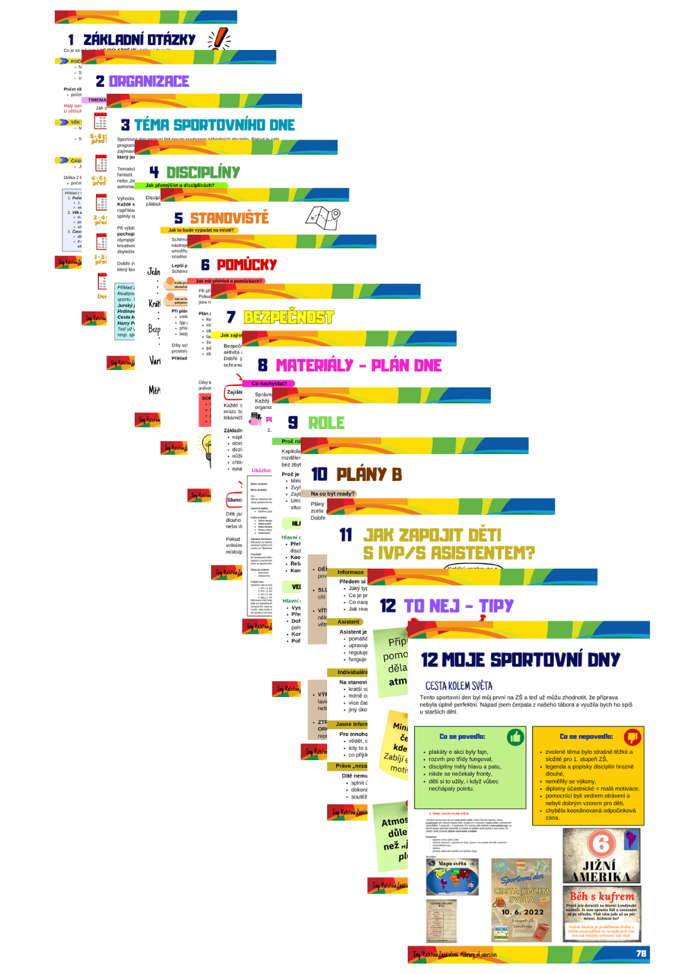 Plán dne a co všechno nachystat, hrací karty vs. sportovní deníky a proč, plakáty, tematické plakáty, diplomy, materiály pro učitele, pro pomocníky, doprovodné materiály ke sportovnímu dni + ukázky mých materiálů (špatných i dobrých)